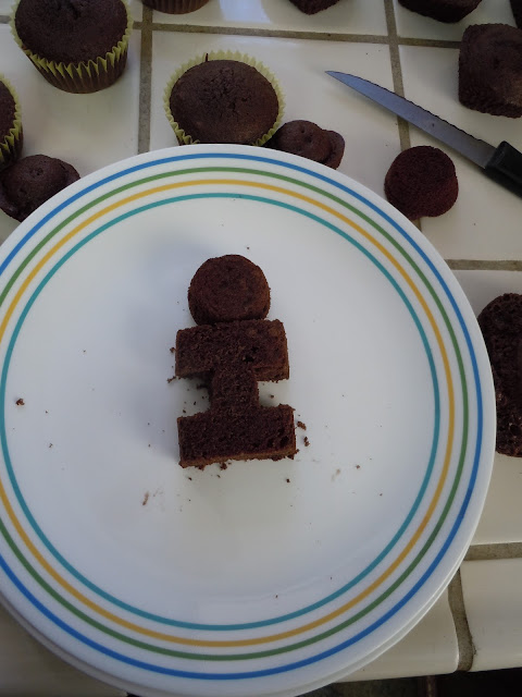 Cut out two very small squares on the sides of the mini loaf. You now have two arms, two legs, and a body shape. Level off cupcake and place at the top for the head.